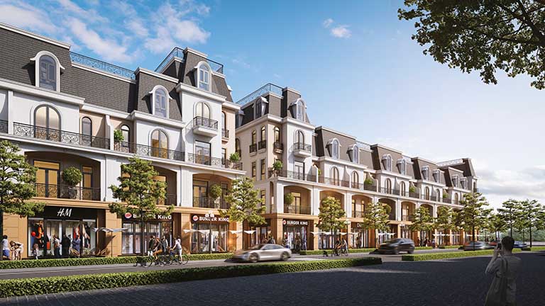 Kiến trúc mặt tiền hiện đại, cá tính, không chỉ khẳng định gu thẩm mỹ tinh tế của gia chủ mà còn tạo nên một dãy phố thương mại quốc tế đẳng cấp. Nơi đây, những cư dân thành đạt cùng nhau kiến tạo nên một cộng đồng văn minh, tinh hoa.